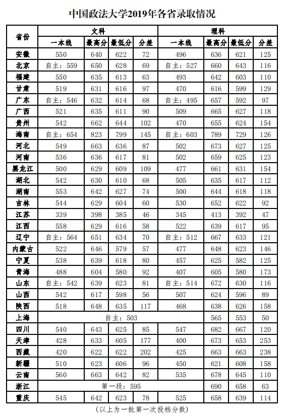 中国政法大学2019年各省录取分数线
